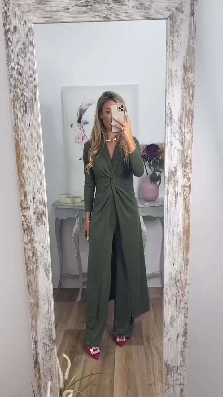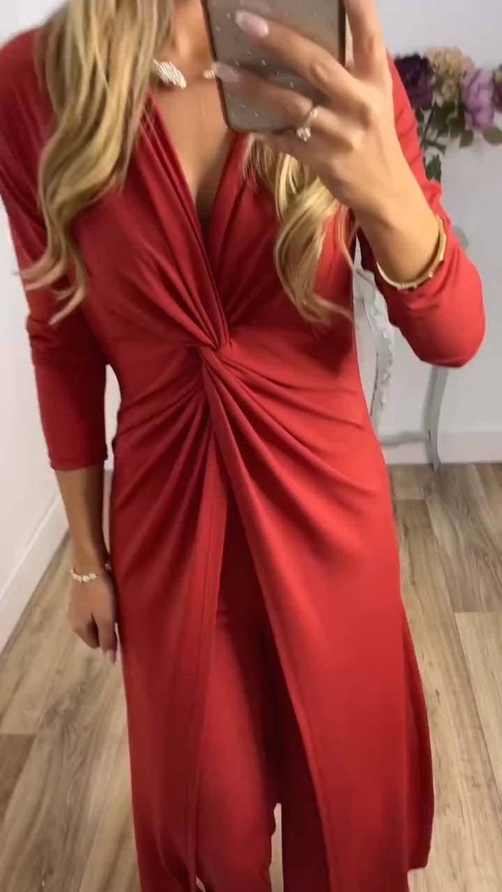 Bénéficiez d’une élégance intemporelle grâce à sa matière douce et son design torsadé unique qui affine la silhouette. Dites adieu aux tenues monotones ou inconfortables – cet ensemble vous offre confiance et raffinement pour briller en toute occasion. Parfait pour les femmes cherchant un look versatile sans effort.